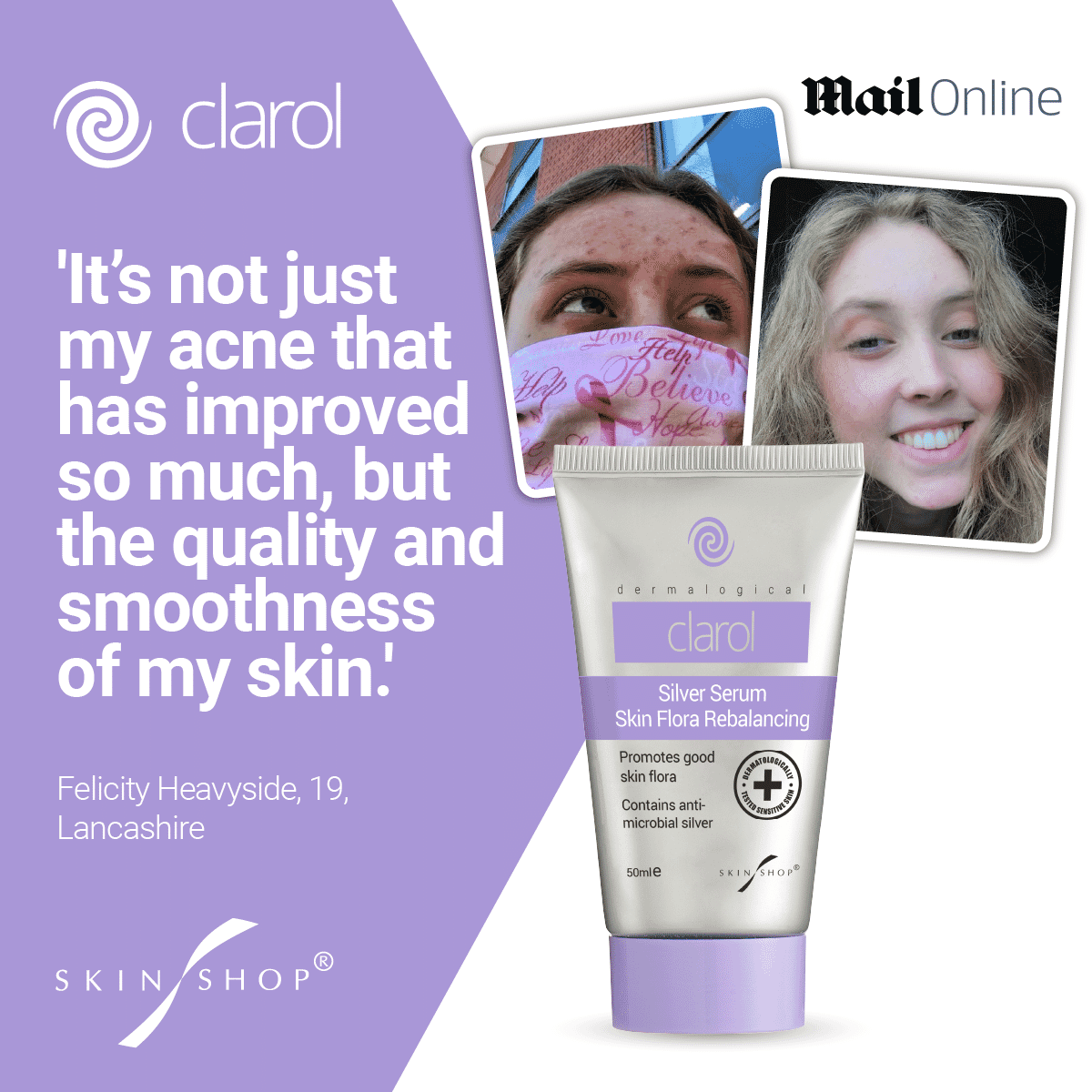 Before using any makeup, apply Clarol Silver Serum. It contains a unique silver ingredient that stays active for 8 hours and targets harmful bacteria while supporting beneficial skin bacteria, so constantly establishing a healthy bacterial balance to aid the skin’s natural acne defences.