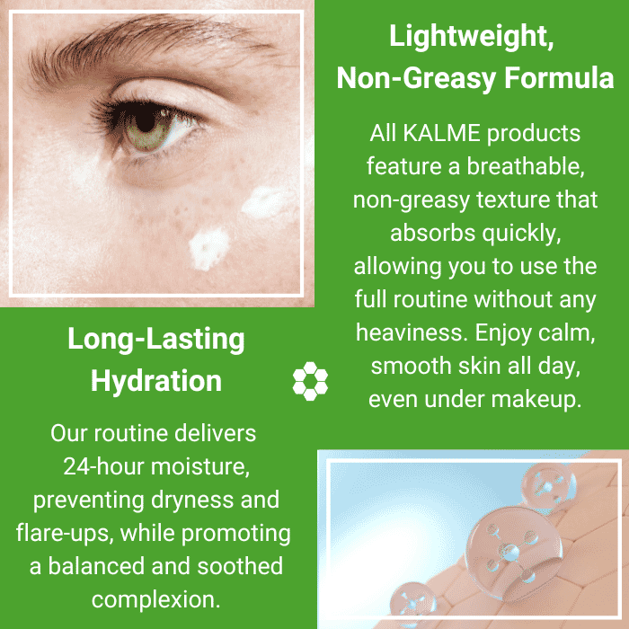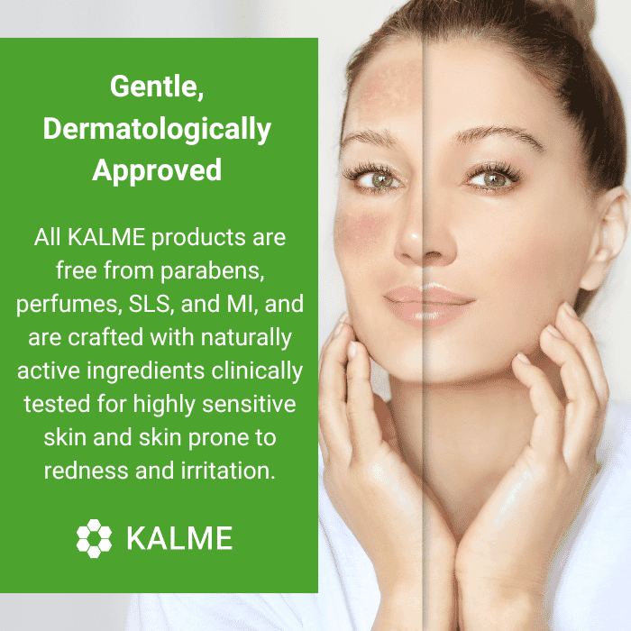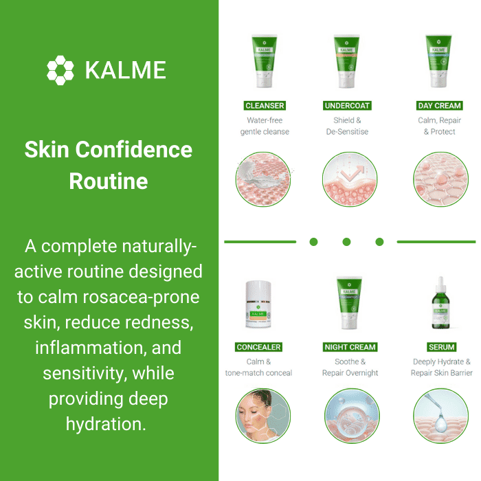 KALME full skincare kit contains a patented ingredient called Indinyl, that has a certified 24-hour moisturising action to combat skin dryness often associated with rosacea.