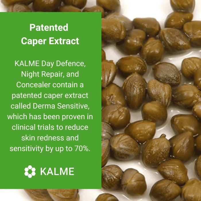 KALME full skincare kit contains a patented caper extract called Derma Sensitive, which has been proven in clinical trials to reduce skin redness and sensitivity by up to 70%.