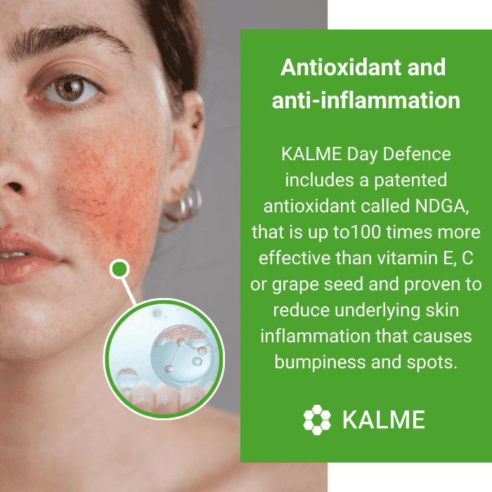KALME full skincare kit includes a patented antioxidant called NDGA, that is up to100 times more effective than vitamin E, C or grape seed and proven to reduce underlying skin inflammation that causes bumpiness and spots.